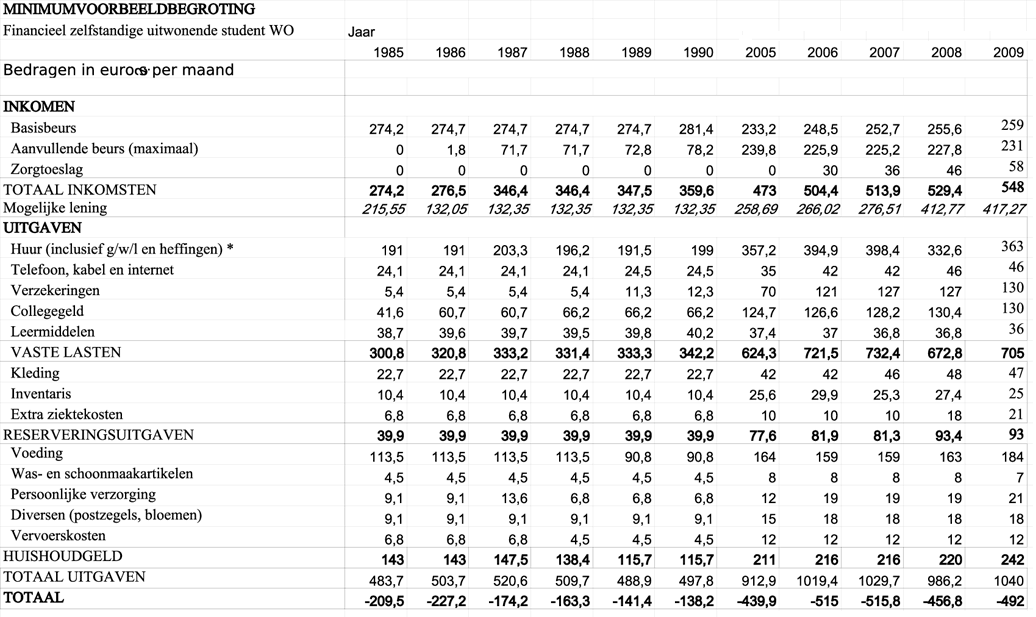 1985-1990: In deze periode hebben studenten gemiddeld € 500,73 per maand. Na de huur van de woning gaat het meetste geld uit naar voeding. De kosten voor telefoon, kabel en internet zijn € 24,10 per maand. Wat op zich nog best logisch is omdat in deze periode de kabeltelevisie erg in opkomst was. Jongeren hadden in die periode nog geen mobile telefoon dus hier hebben ze geen hogen kosten van. Ook zijn de inkomsten van studenten nog niet zo hoog.